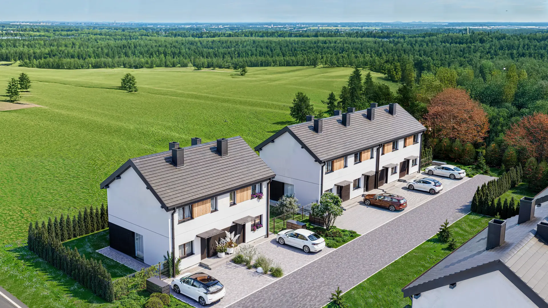 Domy w zabudowie bliźniaczej zaprojektowane z myślą o komforcie mieszkańców, wyróżniają się przestronnymi wnętrzami i prywatnymi ogródkami.
